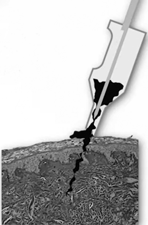 टैटू की स्याही-लेपित सुई त्वचा में प्रवेश करने पर वहां 2 मिलीमीटर गहरा छेद बना देती है। जब सुई त्वचा से बाहर निकलती है, तब इस छोटे छेद में निर्मित निर्वात स्याही को अंदर खींच लेता है। लावल ने इसे एक मांस-नुमा जेल में प्रयोग करके भी दर्शाया है।