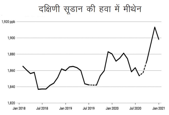 लेकिन पिछले कुछ वर्षों में मीथेन की मात्रा में तीव्र वृद्धि को देखते हुए शोधकर्ताओं को किसी अन्य स्रोत की भी आशंका थी। शोधकर्ताओं ने दक्षिण सूडान स्थित सड के दलदली क्षेत्र का का अध्ययन जापान के ग्रीनहाउस गैसेस ऑब्ज़रवेशन सेटेलाइट की मदद से किया जो मीथेन द्वारा अवशोषित अवरक्त प्रकाश की मात्रा का मापन करता है।