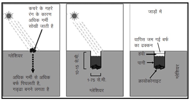 प्रदूषकों की सबसे अधिक मात्रा क्रायोकोनाइट रंध्रों में पाई जाती है। क्रायोकोनाइट रंध्र हिमनद की सतह पर पानी से भरे छिद्र होते हैं जो हिमनद में फंसी हुई तलछट के आसपास की बर्फ ज़्यादा पिघलने के कारण बनते हैं। क्रायोकोनाइट महीन चट्टानी कणों, कालिख (soot) और सूक्ष्मजीवों से निर्मित एक गहरे रंग की भुरभुरी धूल है जो बर्फ, हिमनदों या हिमाच्छदों पर जमा हो जाती है। ये कार्बनिक पदार्थ, पोषक तत्वों एवं अन्य तत्वों को चक्रित करने के गतिशील स्थल हैं जो हिमनद की सतह के अन्यथा शुष्क और सुखाने वाले वातावरण में संभव नहीं हो सकता है। क्रायोकोनाइट्स तब बनते हैं जब प्रकाश संश्लेषक सायनोबैक्टीरिया पर्यावरण में चिपचिपे पदार्थ छोड़ते हैं। ये खनिज धूल, सूक्ष्मजीव और कार्बनिक पदार्थों को एकत्रित कर कणिकाओं का रूप देते हैं। परोपजीवी बैक्टीरिया इन कणिकाओं में बस जाते हैं। इन बैक्टीरिया द्वारा जैविक पदार्थों के अपघटन से ह्यूमिक पदार्थों का निर्माण होता है जिससे कणिकाओं का रंग गहरा हो जाता है। गहरे रंग के कारण क्रायोकोनाइट कणिकाएं और अधिक धूप सोखती हैं जिससे बर्फ पिघलता है और सतह पर छिद्र बन जाते हैं। समय के साथ इन क्रायोकोनाइट रंध्रों की गहराई बढ़ती जाती है और पानी के छोटे-छोटे पोखर बन जाते हैं। ये पोखर मानवजनित संदूषकों के भंडार के रूप में कार्य करते हैं।
