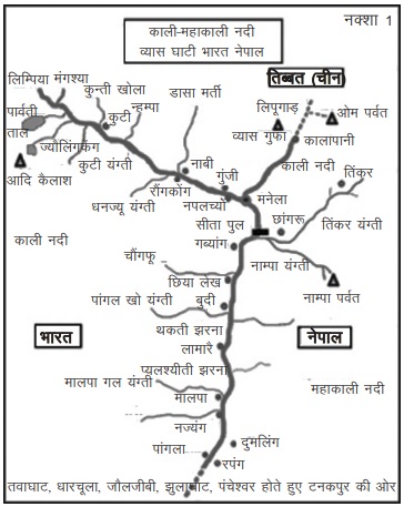काली नदी भारत-नेपाल की लगभग 230 कि.मी. अंतर्राष्ट्रीय सीमा का निर्धारण करते हुए अपनी नदी घाटी (व्यास) को दोनों देशों में विभाजित करती है। माना जाता है कि महर्षि वेद व्यास ने यहां तपस्या की थी, इसलिए इस घाटी को यह नाम दिया गया। इस घाटी में भारत से लगे नदी के पश्चिमी किनारे पर इसे काली नदी और पूर्वी किनारे पर नेपाल में महाकाली नदी कहा जाता है। व्यास घाटी के बाद नदी किनारे पहला भारतीय नगर धारचूला आता है। नदी पार नेपाल में बसे नगर को भी दार्चुला कहा जाता है। आगे जौलजीबी में काली नदी के साथ गौरी नदी का संगम होता है। मध्य हिमालय में इस नदी घाटी को काली कुमाऊं का क्षेत्र कहा जाता है।