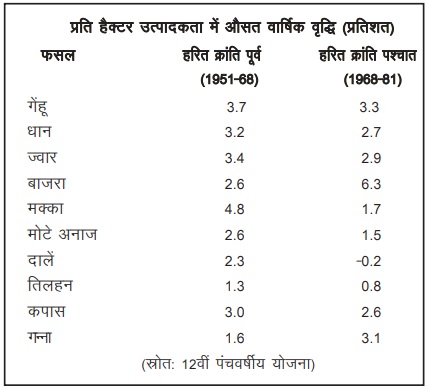 12वीं पंचवर्षीय योजना के दस्तावेज़ में इस बारे में विस्तृत आंकड़े प्रकाशित किए गए हैं कि हरित क्रांति से पहले के 15 वर्षों में उत्पादकता वृद्धि कितनी हुई है तथा उसके बाद उत्पादकता वृद्धि कितनी हुई है? यह जानकारी तालिका में प्रस्तुत है।