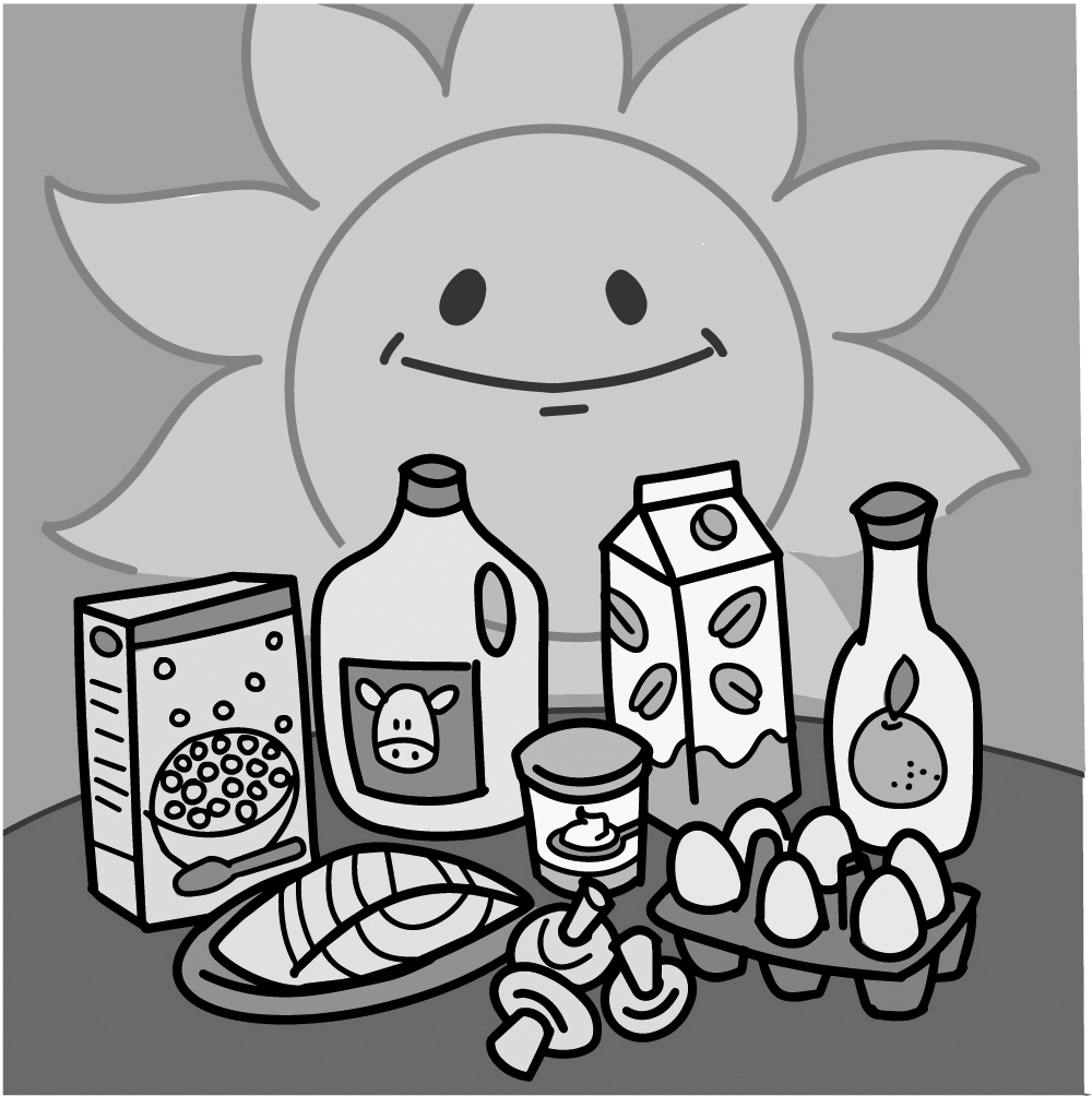 अमेरिकन एकेडमी ऑफ डर्मेटोलॉजी ने वयस्कों को सूर्य के संपर्क या इनडोर टैनिंग के माध्यम से विटामिन डी प्राप्त करने के बजाय आहार स्रोतों का सुझाव दिया है। दुर्भाग्य से, विटामिन डी के प्राकृतिक खाद्य स्रोत दुर्लभ हैं। ट्राउट, ट्यूना, सैल्मन और मैकेरल जैसी वसायुक्त मछलियां, मछली के जिगर के तेल और यूवी-एक्सपोज़्ड मशरूम विटामिन-डी के सबसे अच्छे स्रोत हैं। इसकी कुछ मात्रा अंडे की ज़र्दी, पनीर और बीफ लीवर में पाई जाती है। यूएस, यूके और फिनलैंड सहित विभिन्न देश इस कमी को दूर करने के लिए दूध, अनाज, संतरे का रस और दही जैसे उत्पादों को विटामिन डी से समृद्ध करते हैं। लेकिन इसमें दिक्कतें हैं। जैसे, एक कप विटामिन डी युक्त दूध में आम तौर पर लगभग 3 माइक्रोग्राम विटामिन डी होता है, जबकि 70 से कम उम्र वालों के लिए 15 माइक्रोग्राम और इससे अधिक उम्र के वयस्कों के लिए 20 माइक्रोग्राम ज़रूरी है।