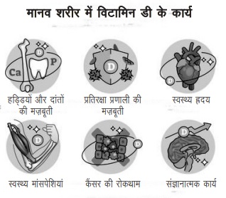विटामिन डी का प्रमुख कार्य भोजन से कैल्शियम को अवशोषित करने में मदद करना है। यह अवशोषण प्रक्रिया हमारी हड्डियों को मज़बूत रखने में महत्वपूर्ण है। इसके अलावा यह मांसपेशियों के कार्य, तंत्रिका संचार और हानिकारक बैक्टीरिया तथा वायरस के खिलाफ हमारी प्रतिरक्षा प्रणाली को मज़बूत करने में महत्वपूर्ण भूमिका निभाता है।