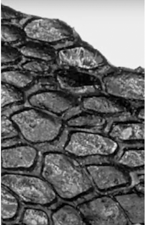 जब युनिवर्सिटी ऑफ टोरंटो के एथान मूनी इन जीवाश्मों का अध्ययन कर रहे थे तो उन्हें एक जीवाश्म पर नाखून से भी छोटी और बाल से भी पतली, नाज़ुक सी बहुत सारी कण जैसी संरचनाएं दिखीं। पहले तो लगा कि ये हड्डी के ही हिस्से हैं। लेकिन सूक्ष्मदर्शी से अवलोकन करने पर पता चला कि वास्तव में यह जीवाश्म तो किसी जीव की त्वचा का है, जिसमें बाह्यत्वचा और उसके नीचे वाली परत सुरक्षित है। त्वचा की बनावट कुछ-कुछ बबल वाली पॉलीथीन की तरह थी - त्वचा दूर-दूर स्थित मुड़े हुए शल्कों जैसी संरचना से बनी थी जिनके बीच में लचीले कब्जे थे, जो वृद्धि और हिलना-डुलना-मुड़ना संभव बनाते हैं।