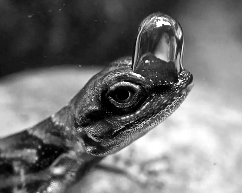 कोस्टा रिका और पनामा के वर्षा वनों में वॉटर एनोल (Anolis aquaticus) नामक एक छोटी, अर्ध-जलीय छिपकली में जान बचाने के लिए अनोखी रणनीति विकसित हुई है। यह पानी के अंदर हवा के बुलबुले बनाकर उन्हें ऑक्सीजन टैंक की तरह इस्तेमाल करती है। इस तकनीक से छिपकली लंबे समय तक पानी में छिपकर पक्षियों और सांप जैसे शिकारियों से स्वयं को सुरक्षित रखती है।