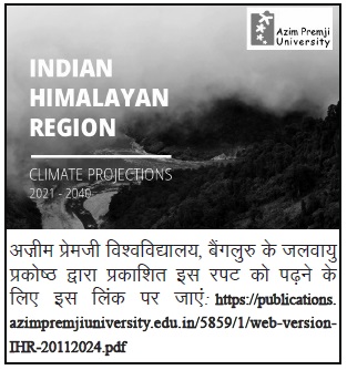 अज़ीम प्रेमजी विश्वविद्यालय, बैंगलुरु के जलवायु प्रकोष्ठ द्वारा प्रकाशित एक रपट जलवायु परिवर्तन के मुख्य प्रभावों, उनके सामाजिक-आर्थिक परिणामों, और अनुकूलन रणनीतियों पर गहन दृष्टि प्रदान करती है। रपट के अनुसार, जलवायु परिवर्तन से हिमालयी ज़िलों में तापमान, वर्षा और प्राकृतिक आपदाओं के स्वरूप में बड़े बदलाव देखे जा रहे हैं।